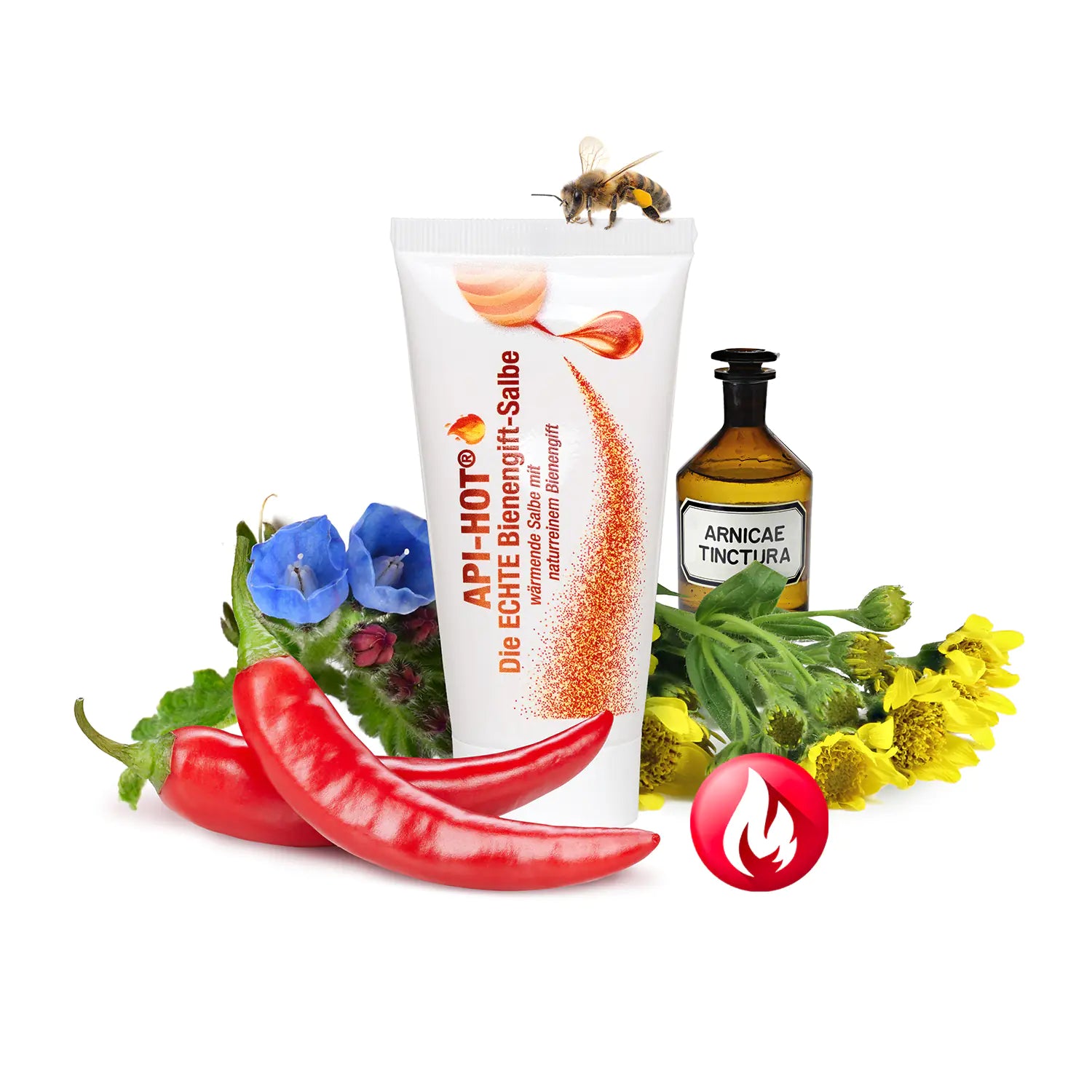 Die API-HOT® verbindet zwei Welten: Jahrhunderte alte Kräuter-Essenzen aus Arnica Montana und Beinwell treffen auf den feurigen Extrakt der Chilischote. Zusammen mit naturreinem Bienengift erster Güte entsteht eine gezielte Wärme-Komposition, die durch Vanillyl Alkohol auf einer zweiten Ebene unterstützt wird. Je nach Hauttyp angenehm leicht bis intensiv wärmend, ist diese Massage-Salbe mit 99,7 % natürlichem Ursprung eine der reinsten Rezepturen ihrer Art.
