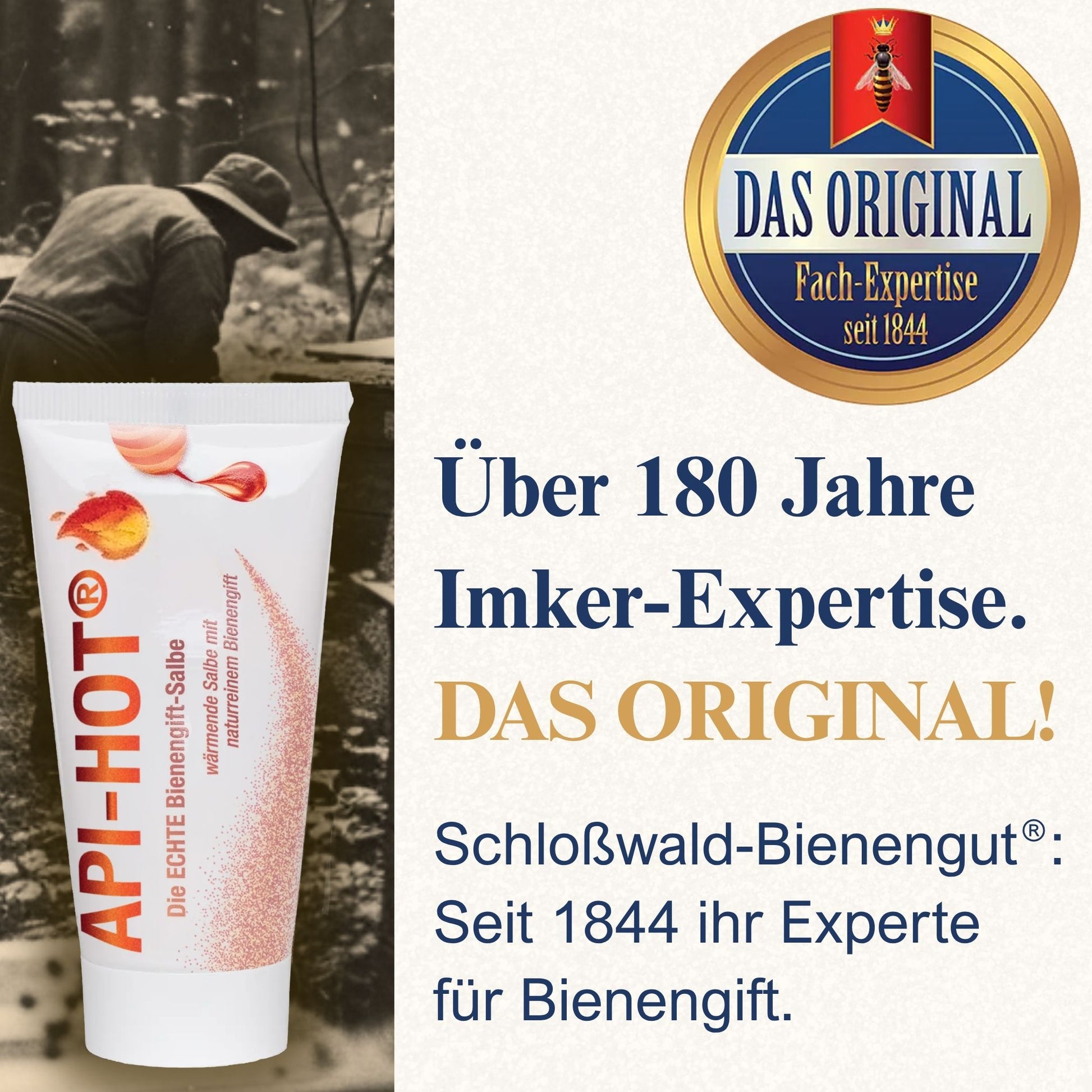 Seit fünf Generationen steht die Imkerei-Familie für kompromisslose Qualität. Als einziger deutscher Hersteller mit echter Imkerei-Fach-Expertise seit 1844 garantiert Schloßwald-Bienengut® für seine weltweit zugelassenen Bienengift-Produkte höchste Standards: Das verwendete Bienengift erreicht einen Melittin-Anteil von 65- bis über 70 % – Arbeitsqualität auf Spitzenniveau. Und das Beste: Für die schöne Gewinnung muss kein einziges Biene sterben.