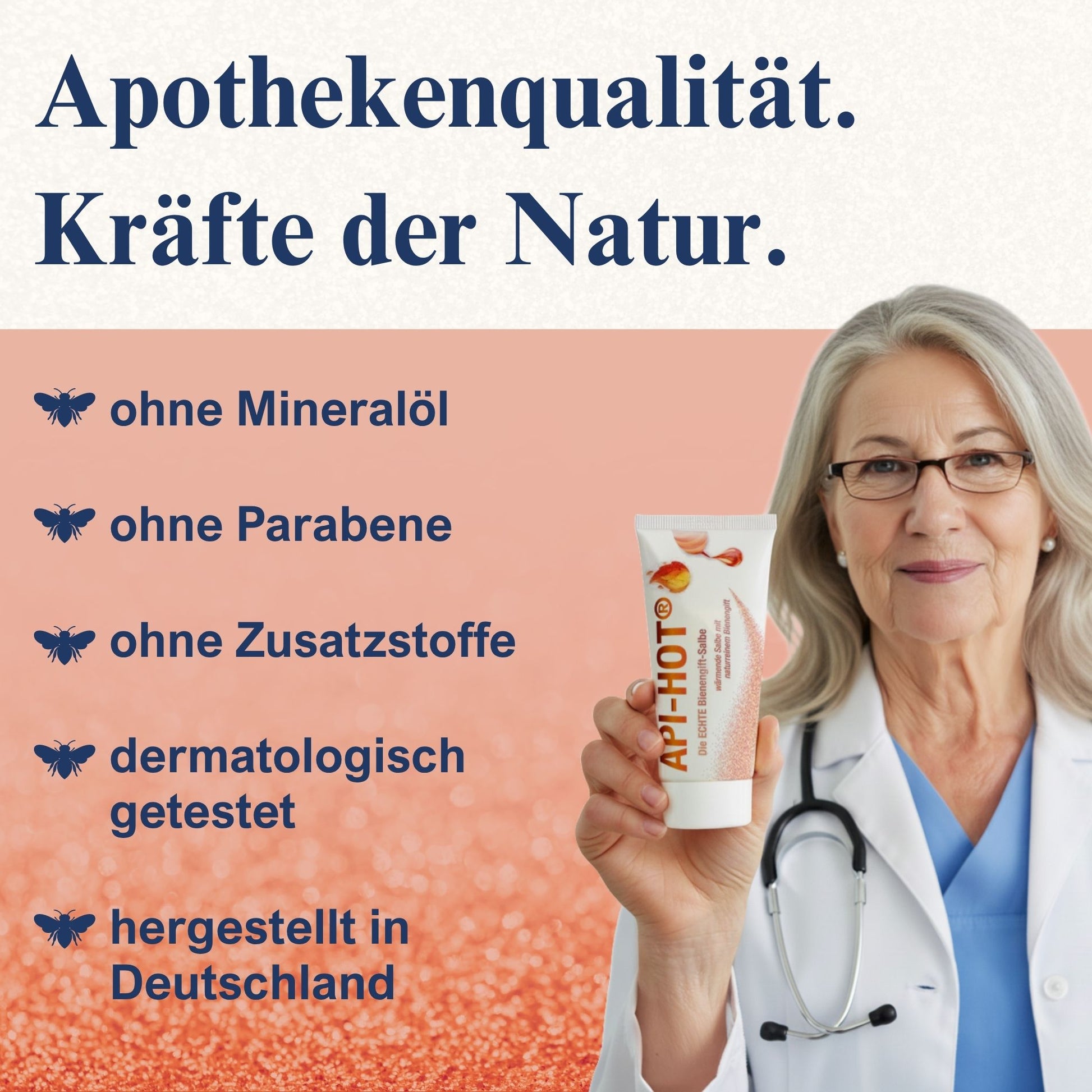 Die reichhaltige Formel vereint pflegendes Mandelöl, Olivenbutter und Bienenwachs mit Arnika-Montana-Blütenextrakt und hautberuhigendem Allantoin aus Beinwell. Die wärmende Chili-Komponente (Capsicum-Extrakt) verstärkt das wärmende Hautgefühl spürbar. API-HOT® ist mit 99,7 % natürlicher Zusammensetzung frei von Mineralölen, Parabenen und Mikroplastik – dermatologisch und klinisch getestet, 100 % Made in Germany.